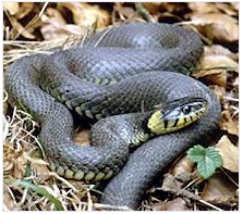waeter. De ringslange kan goed zwemmen en vangt dan graeg een kikkert